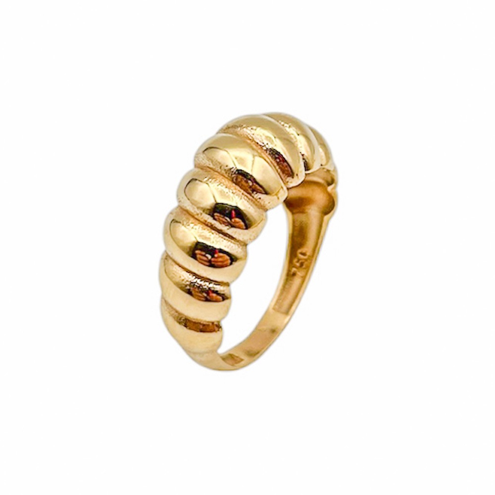 انگشتر کروسان اکسترا یکی از مدلهای شاخص سبک مدرن است که با الهام از شکل هلالی کروسان، فرمی حجیم اما نرم دارد. این مدل از طلای ۱۸ عیار ساخته شده و انحنای پرحجم آن جلوهای لوکس و خاص ایجاد میکند.در طراحی “اکسترا”، قطر حلقه و برجستگی سطح نسبت به مدل کلاسیک بزرگتر است تا جلوهی بیشتری روی دست داشته باشد، بیآنکه سنگینی یا ناراحتی ایجاد کند. سطح آینهای صیقلی آن نور را در هر زاویهای منعکس میکند و نمادی از جسارت و اعتمادبهنفس است.
