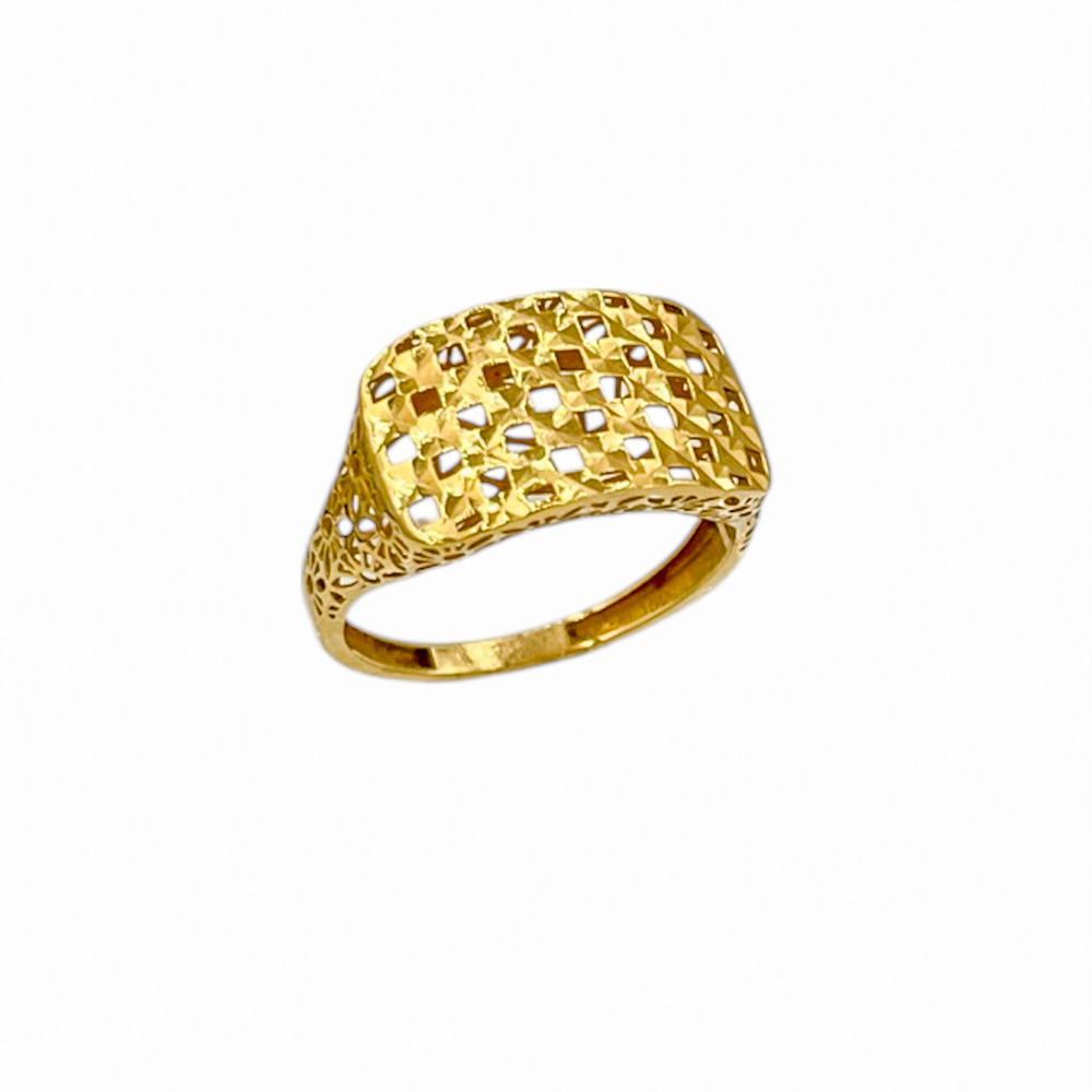 انگشتر توری مربع (Square Mesh Gold Ring) الهامگرفته از بافتهای معماری مدرن است؛ ساختاری منظم از مربعهای توخالی که درون حلقه با دقت تراش خوردهاند. این طراحی شفاف، همانقدر که ظریف است، قدرتمند هم هست — تلفیقی از نظم هندسی و درخشندگی طلا.