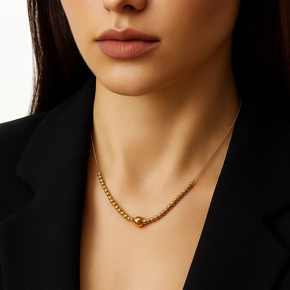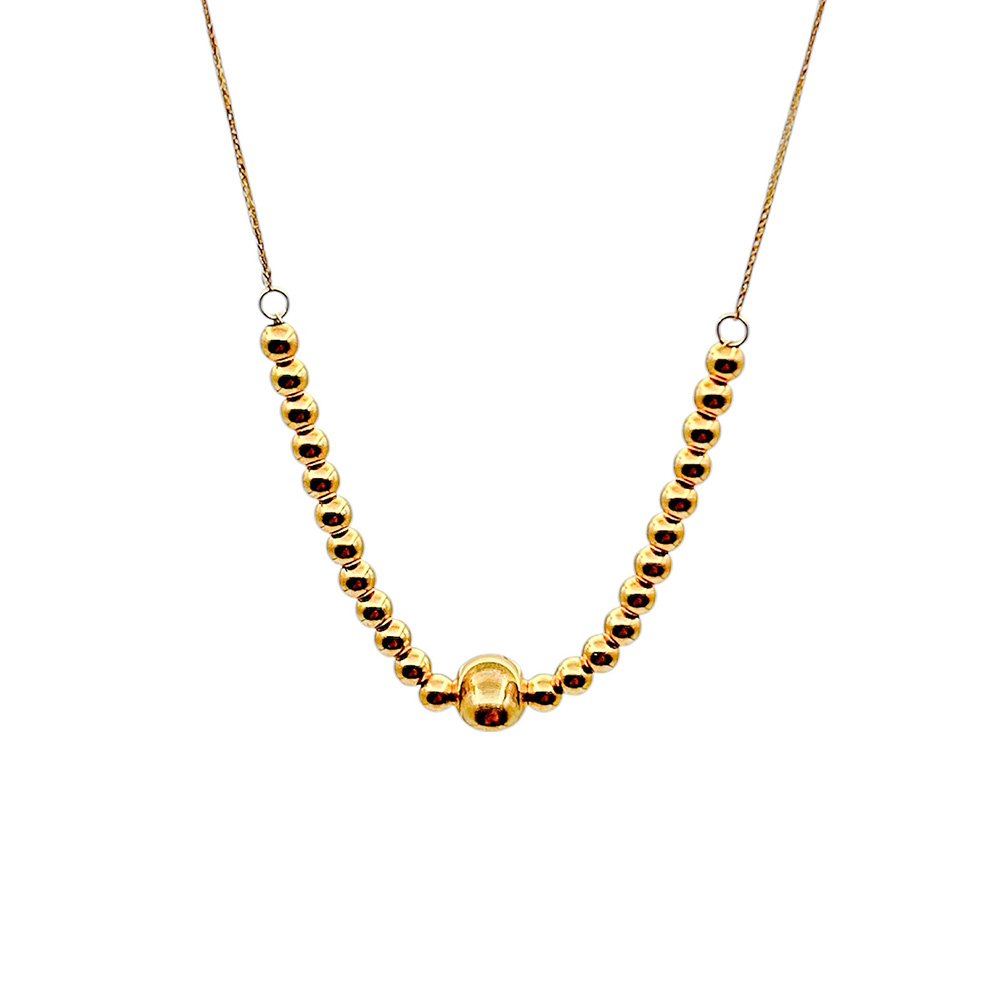 طراحی ساده اما چشمگیر، با آویز گوی طلا که نماد خلوص و بیزمانی است. سطح صیقلی و براق آن بازتابی از مهارت و هنر ساخت جواهرات اصیل را نشان میدهد. مناسب هدیهای ماندگار یا تکمیل مجموعه شخصی شما.